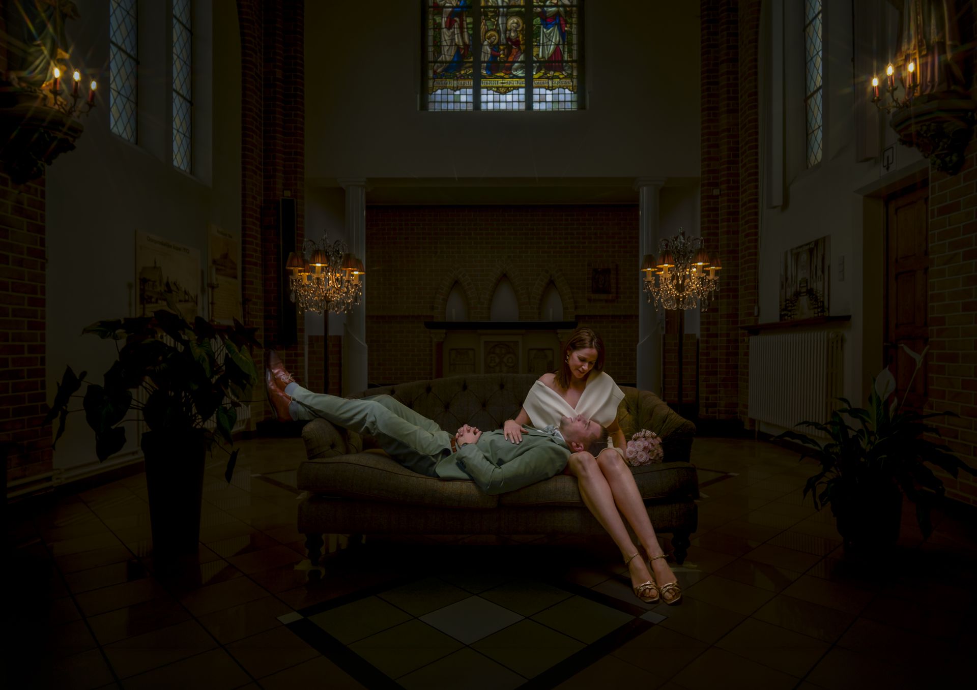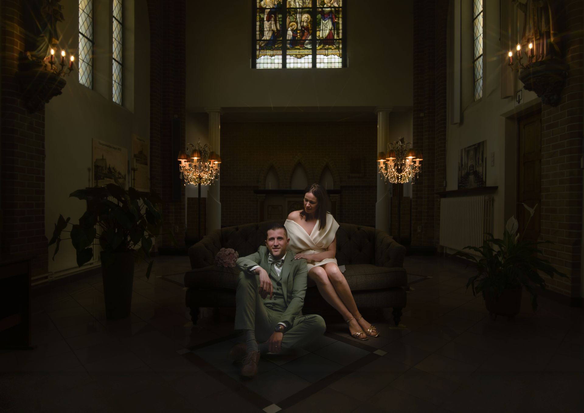 The results speak for themselves: the combination of the authentic brick walls, the stained glass windows, and the warm chandeliers created images with a timeless elegance.
